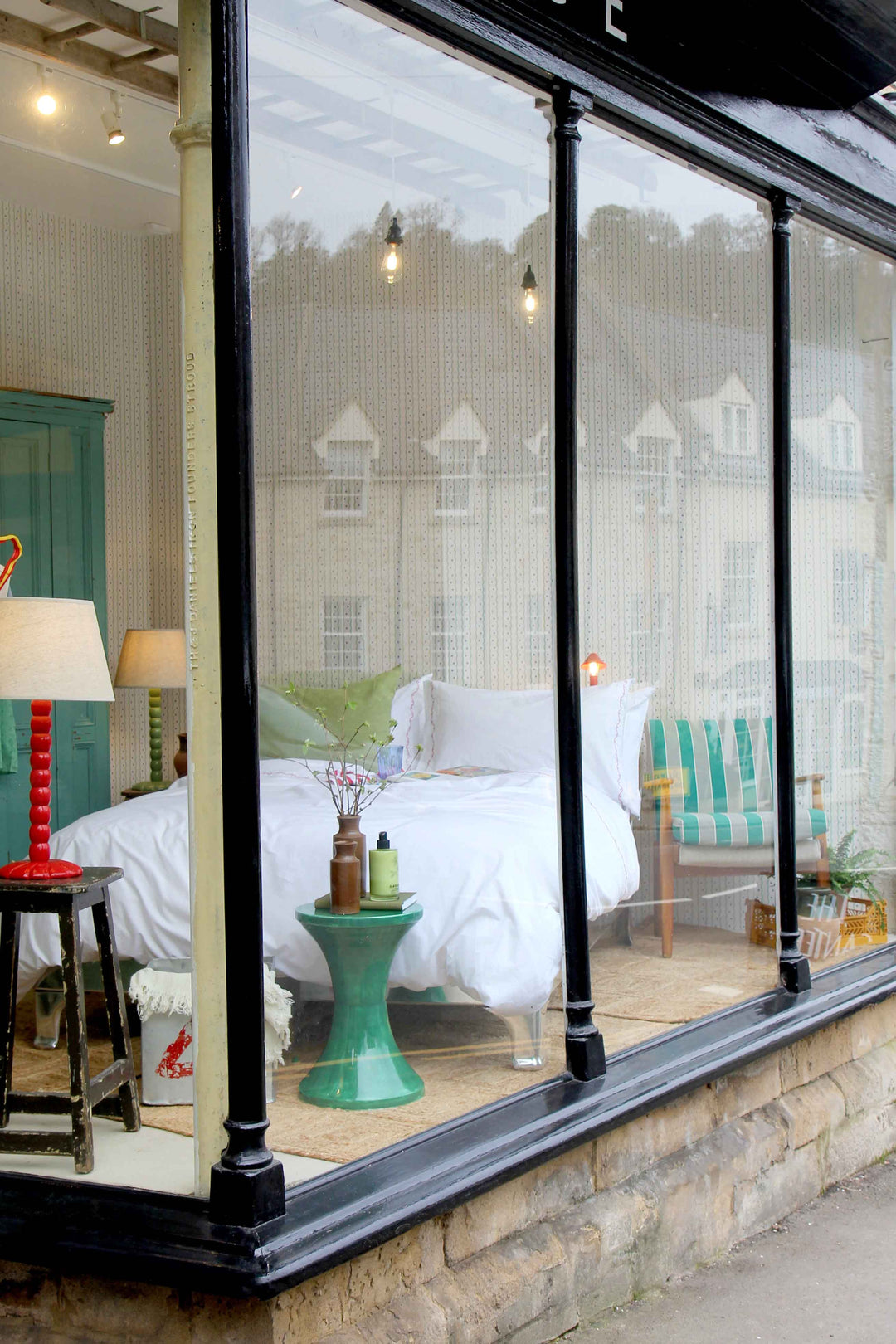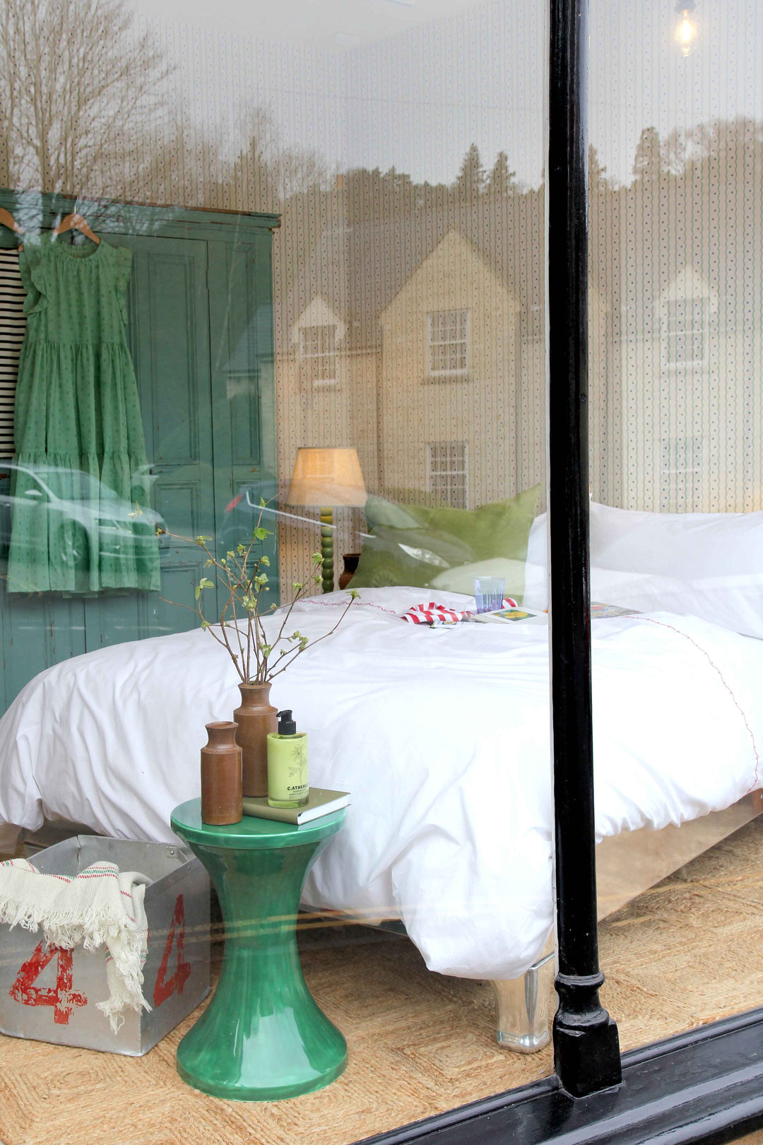 Our Nailsworth team have been busy this week, resetting the window, featuring our Honfleur Wallpaper in Peapod to liven up the walls, a staple green bobbin lamp and the new Poppy Red Criss-Cross stitched bedding. Of course not forgetting vintage touches and colourful accessories to complete a fun Domestic Science styled bedroom. Follow us on Instagram for a behind the scenes of how we created this window display.