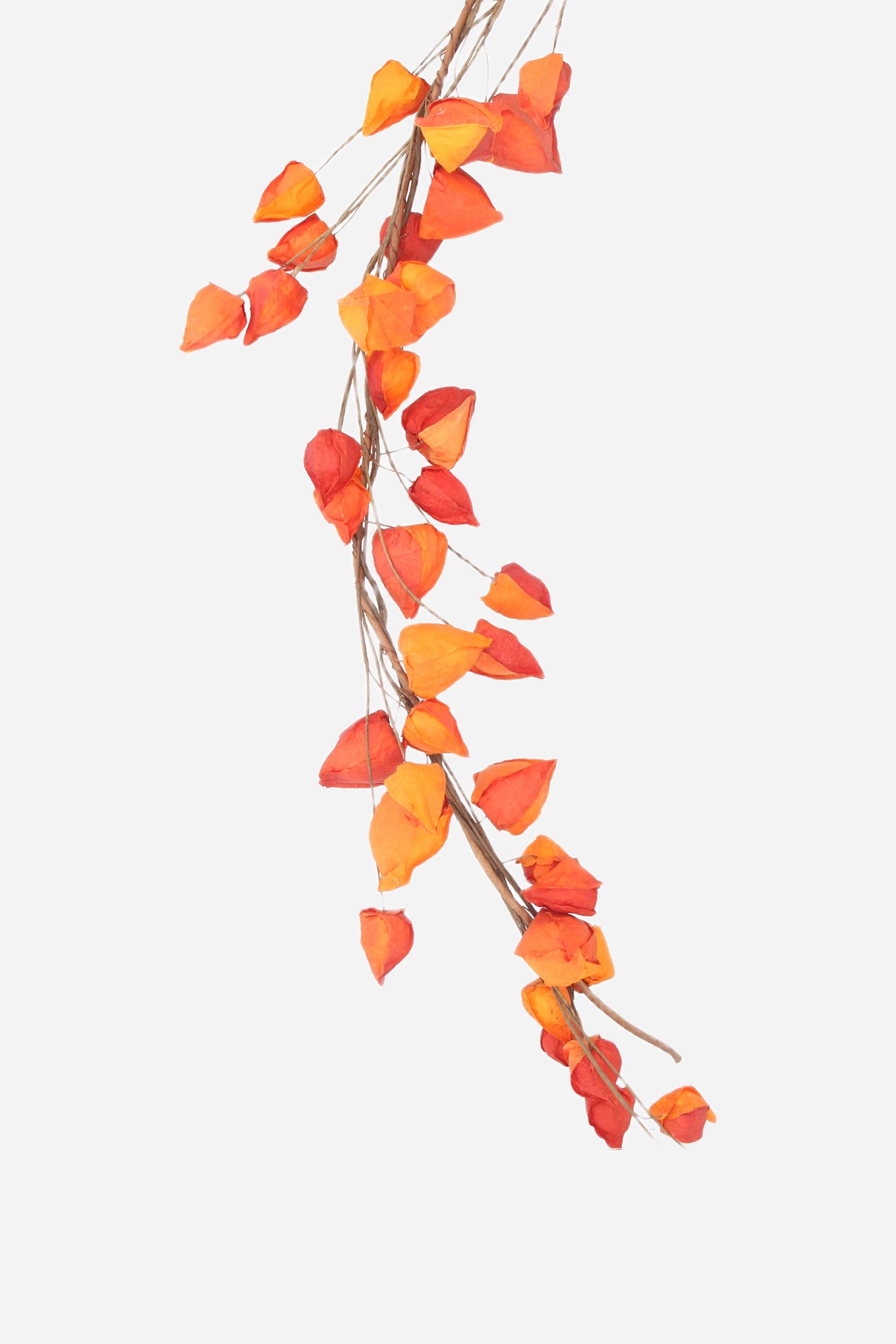 Bring the soft glow of autumn with this Orange Physalis Garland. Vibrant orange and red physalis lanterns dance along faux leafy branches, bringing seasonal warmth and rustic elegance to any room.