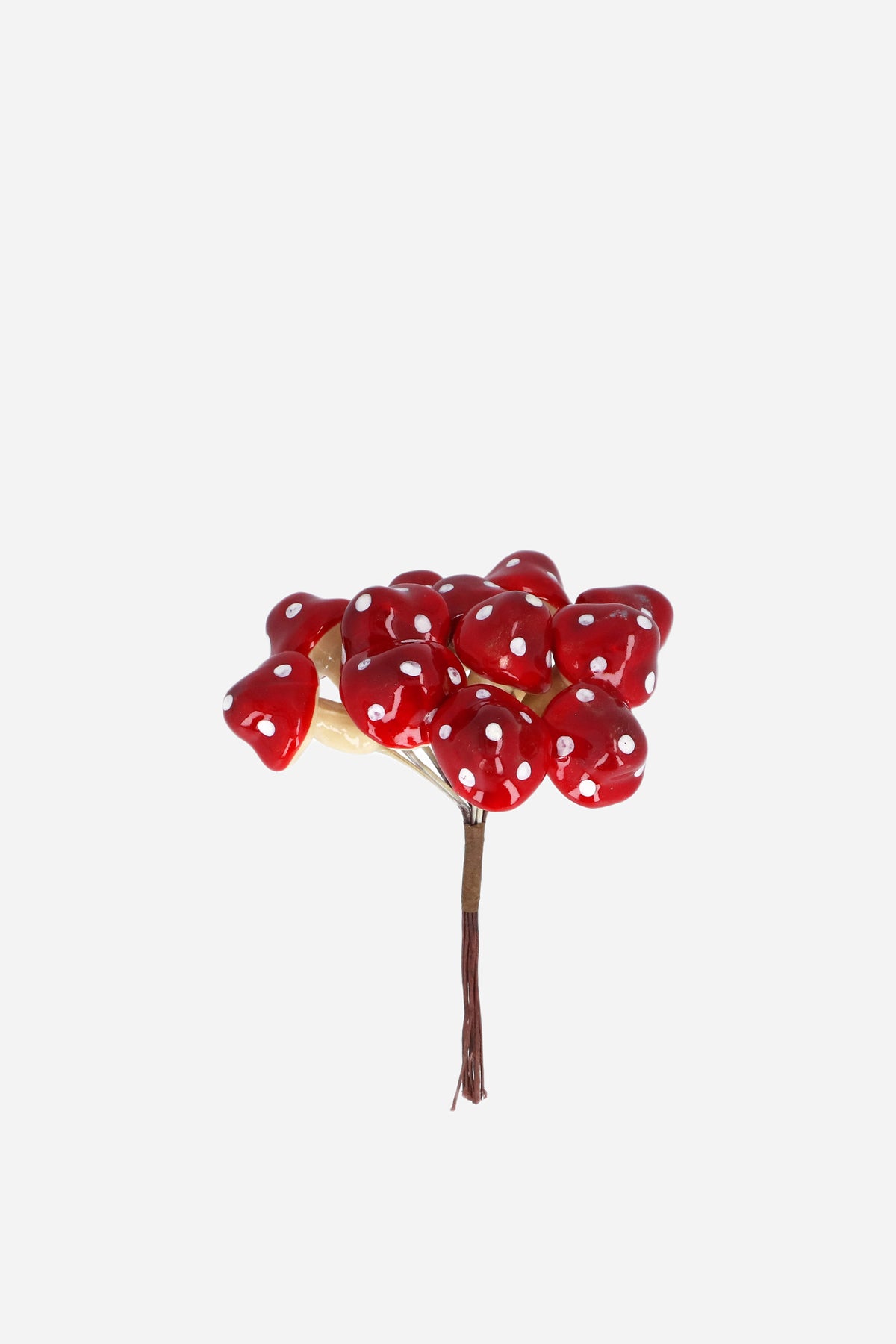 A pack of 12 whimsical red-and-white toadstools on flexible wire stems - perfect for adding a charming, seasonal touch to wreaths, garlands, floral arrangements, or festive centrepieces. These miniature mushrooms bring a woodland-inspired feel to autumn and winter décor, ideal for creating cosy, nature-themed displays throughout the home.
