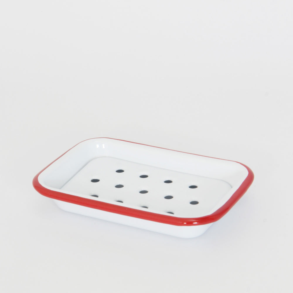 Classic white and red enamel soap dish with removable tray and draining holes to ensure you're bar of soap doesn't get soggy! White enamel with red trim.