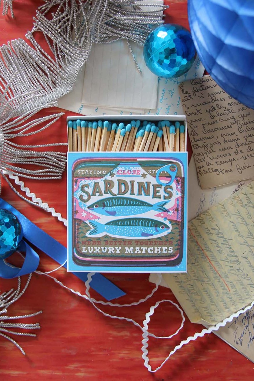 Stunning box of luxury matches. Inspired by print ephemera and food found in small supermarkets on her travels, Louise Lockheart from The Printed Peanut has created this wonderfully joyful We're Better Together Sardine design.