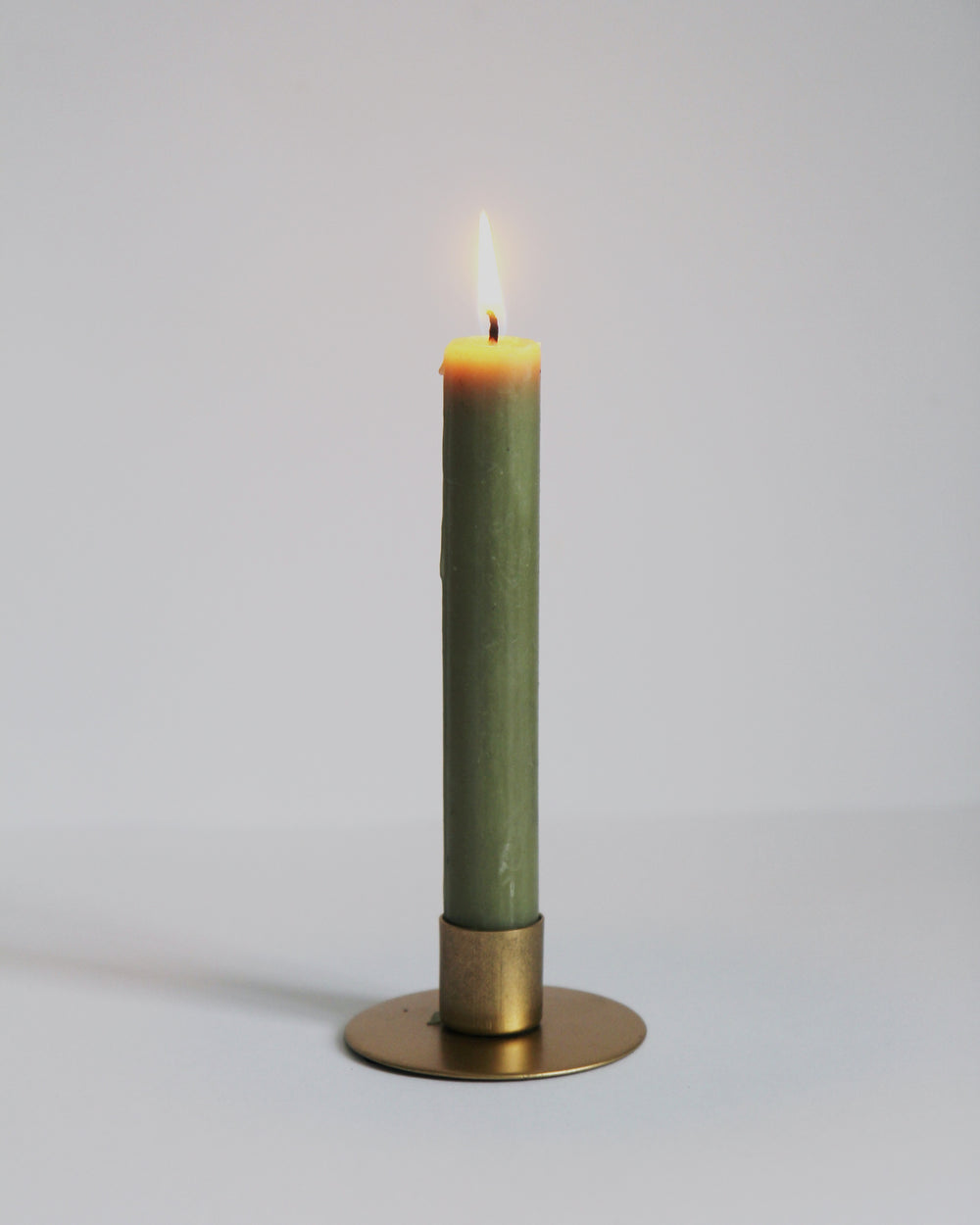 This simple dinner candle holder is made from metal and has a brass coloured finish.