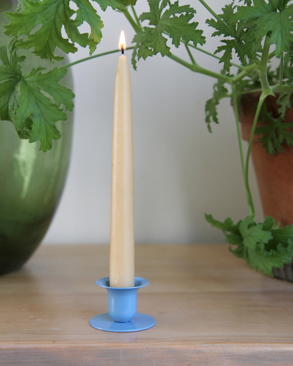 This Kitchen Blue coloured metal candle holder fits a standard dinner candle.