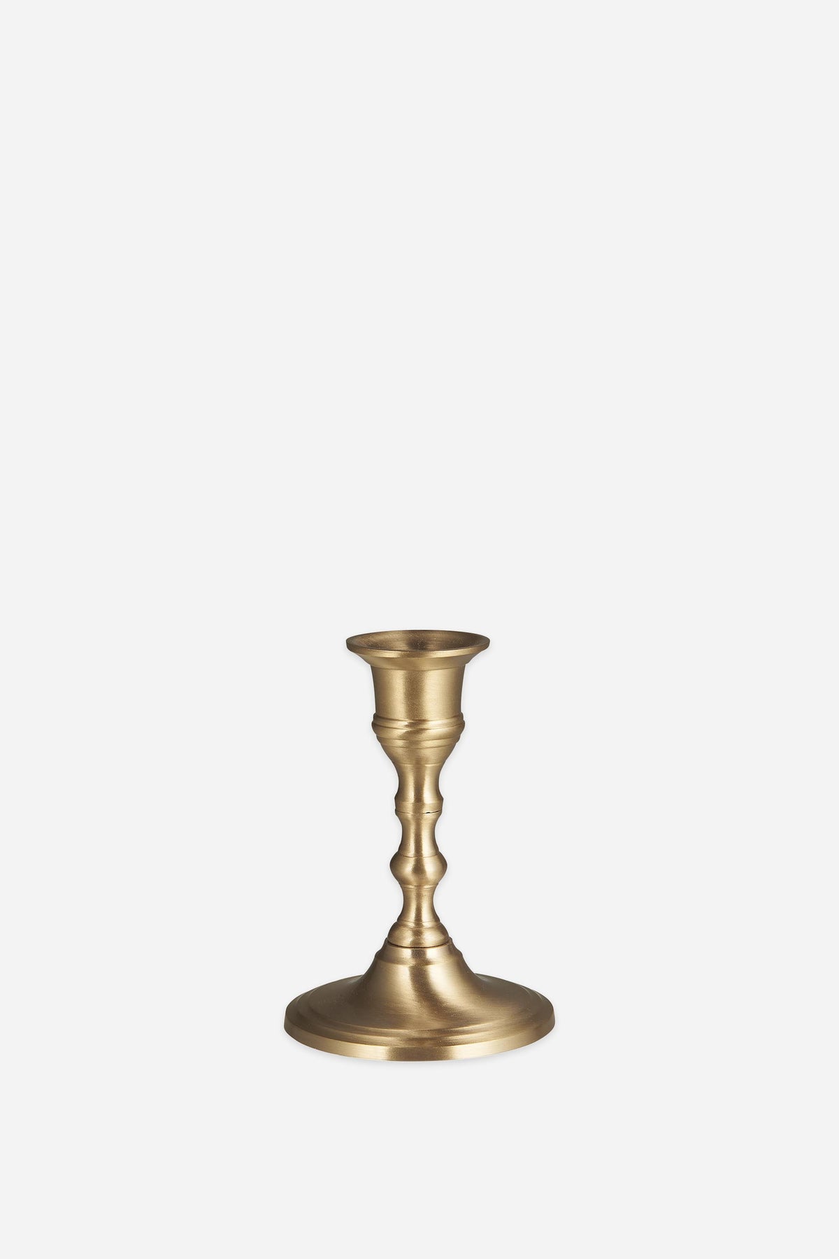Bring a warm, vintage-inspired glow to your home with this tall brass candle holder. Crafted from metal with an antique-style finish and elegant shape, it features a wide base to catch any wax drips while protecting your surfaces.
