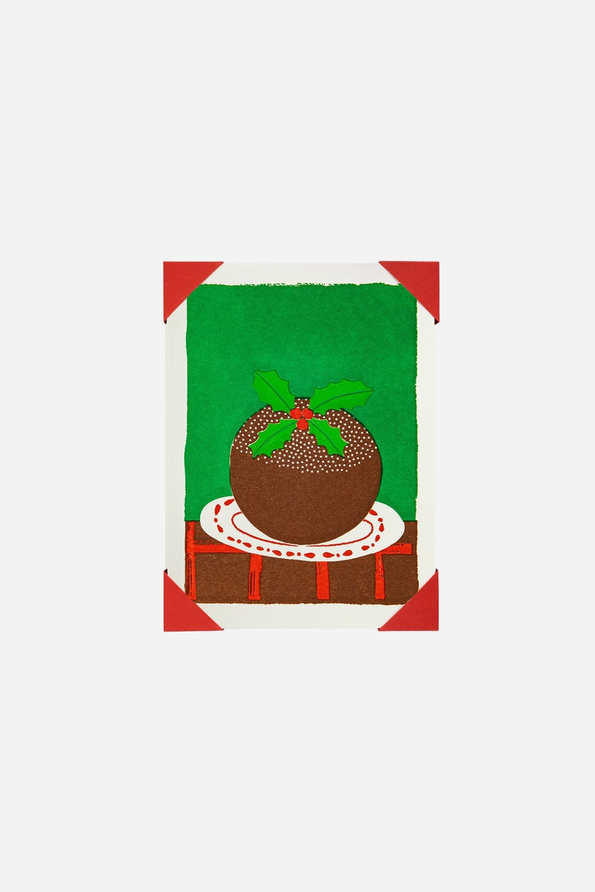 Celebrate the season with charm and simplicity. This pack of Christmas‑cards features a letterpress design of a classic pudding sitting atop a chequered table - a joyful wink to festive tradition. Each card is blank inside, making it perfect for your personalised message, and comes with a crisp white envelope.