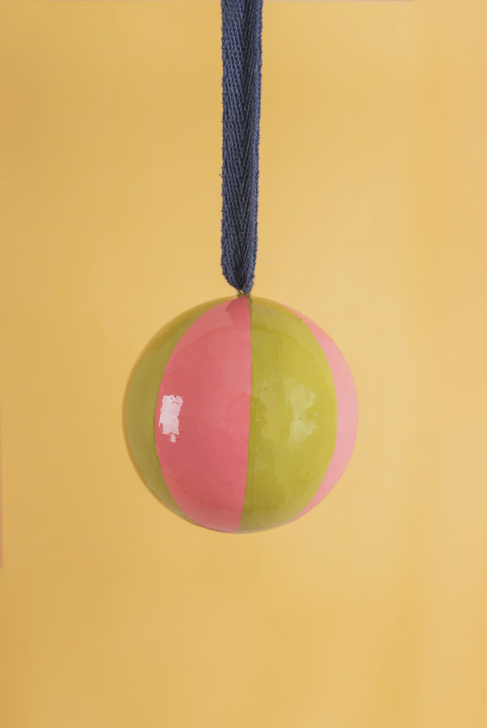 Hand-painted in fun tones oasis green and rose pink, this papier-mâché bauble brings a playful yet elegant touch to your festive décor. Featuring a bold beachball stripe pattern, it captures the charm of contemporary design with its clean lines and cheerful stripes. Each bauble is handmade from recycled paper and carefully painted by skilled artisans, making every piece unique with its own character and subtle variations.