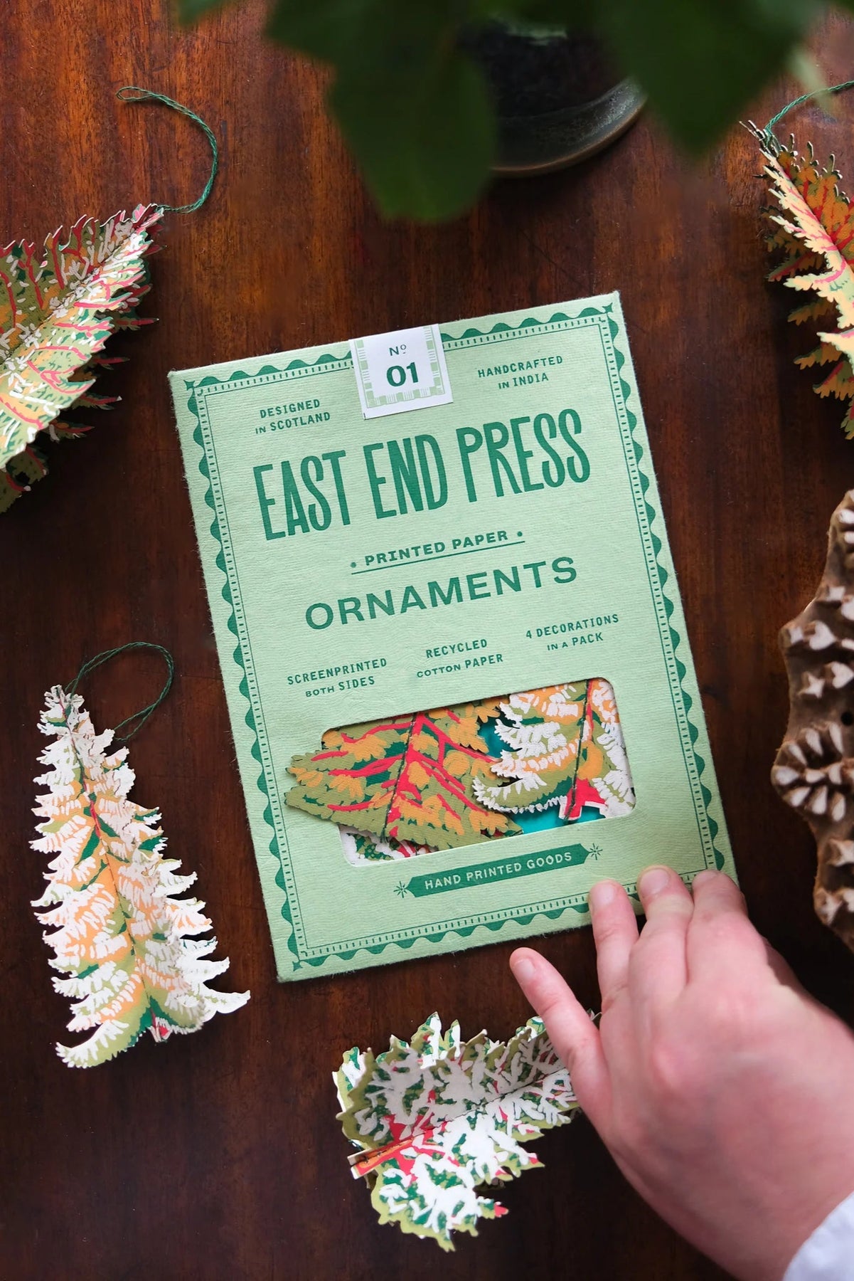 This set of four handcrafted paper decorations, in soothing muted yellows and rich greens, evokes the gentle beauty of an evergreen forest.