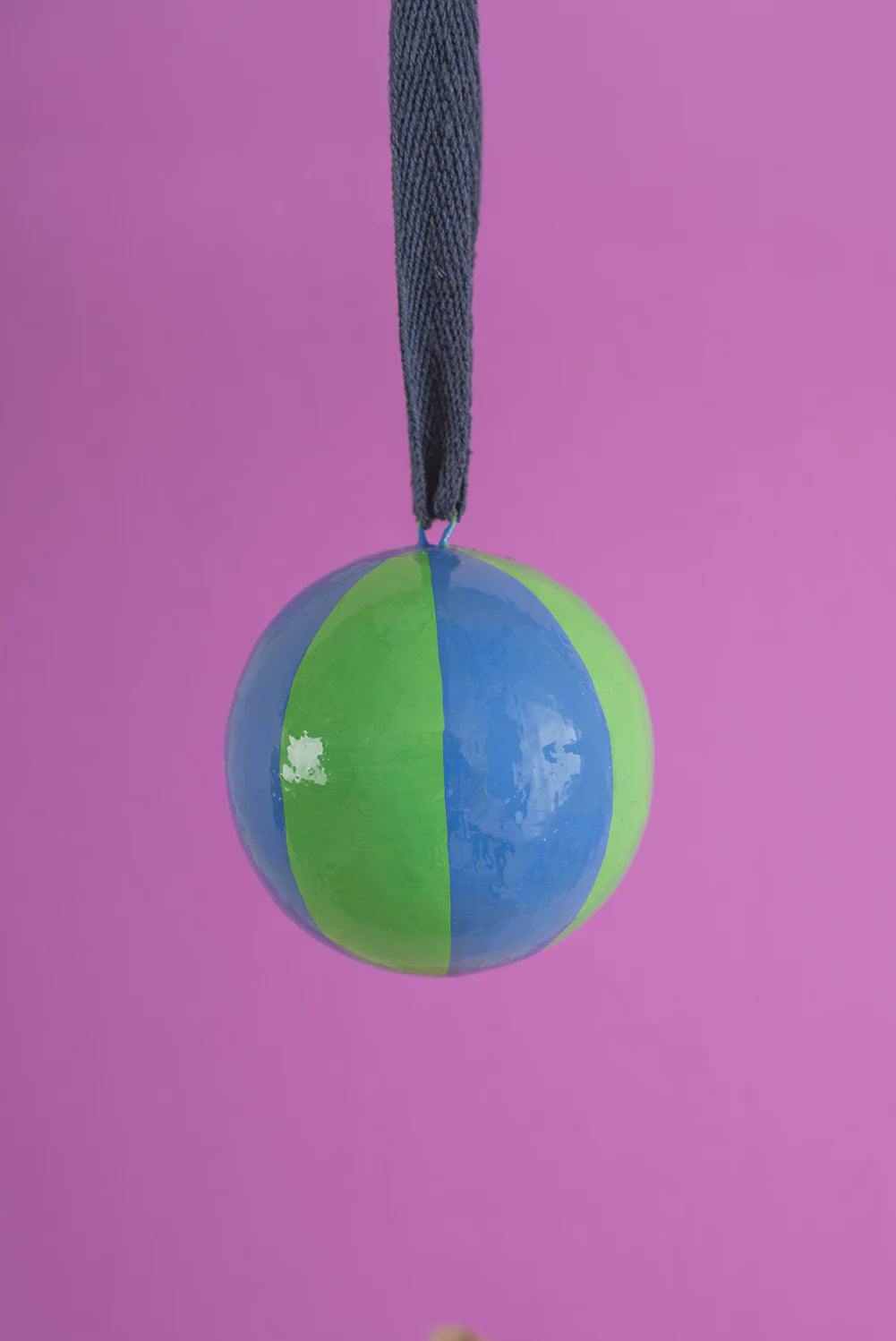 Hand-painted in fun tones viridis green and bright blue, this papier-mâché bauble brings a playful yet elegant touch to your festive décor. Featuring a bold beachball stripe pattern, it captures the charm of contemporary design with its clean lines and cheerful stripes. Each bauble is handmade from recycled paper and carefully painted by skilled artisans, making every piece unique with its own character and subtle variations.