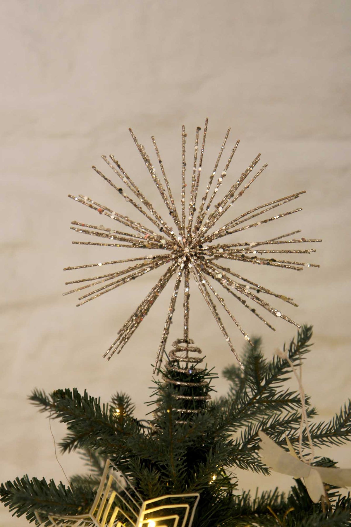 A spiral wire base lets you secure it neatly atop your tree, and the lightweight construction ensures it perches with ease. Whether styled on a classic green fir or a coloured bristle tree, this star brings a dazzling, nostalgic sparkle to your holiday setting.