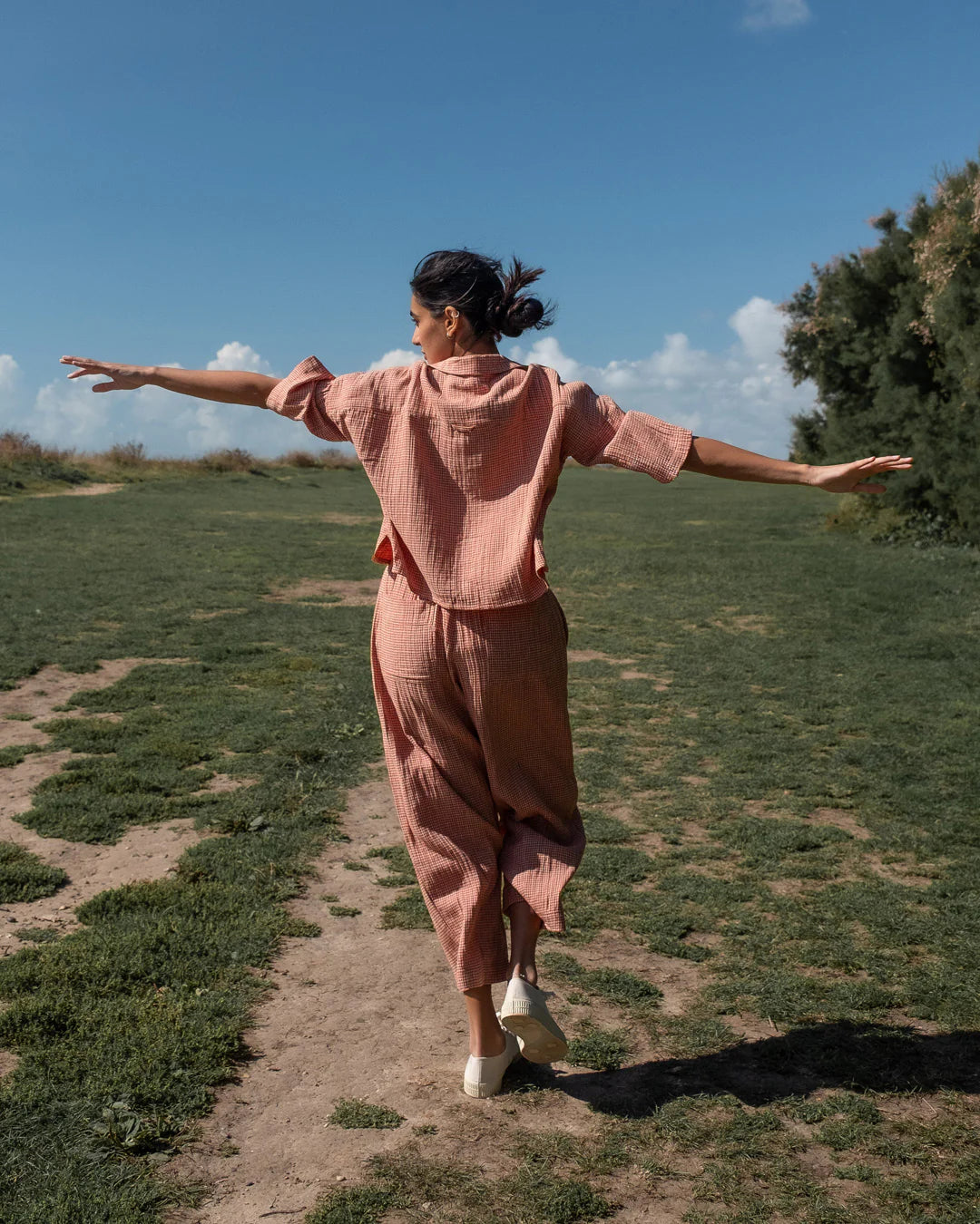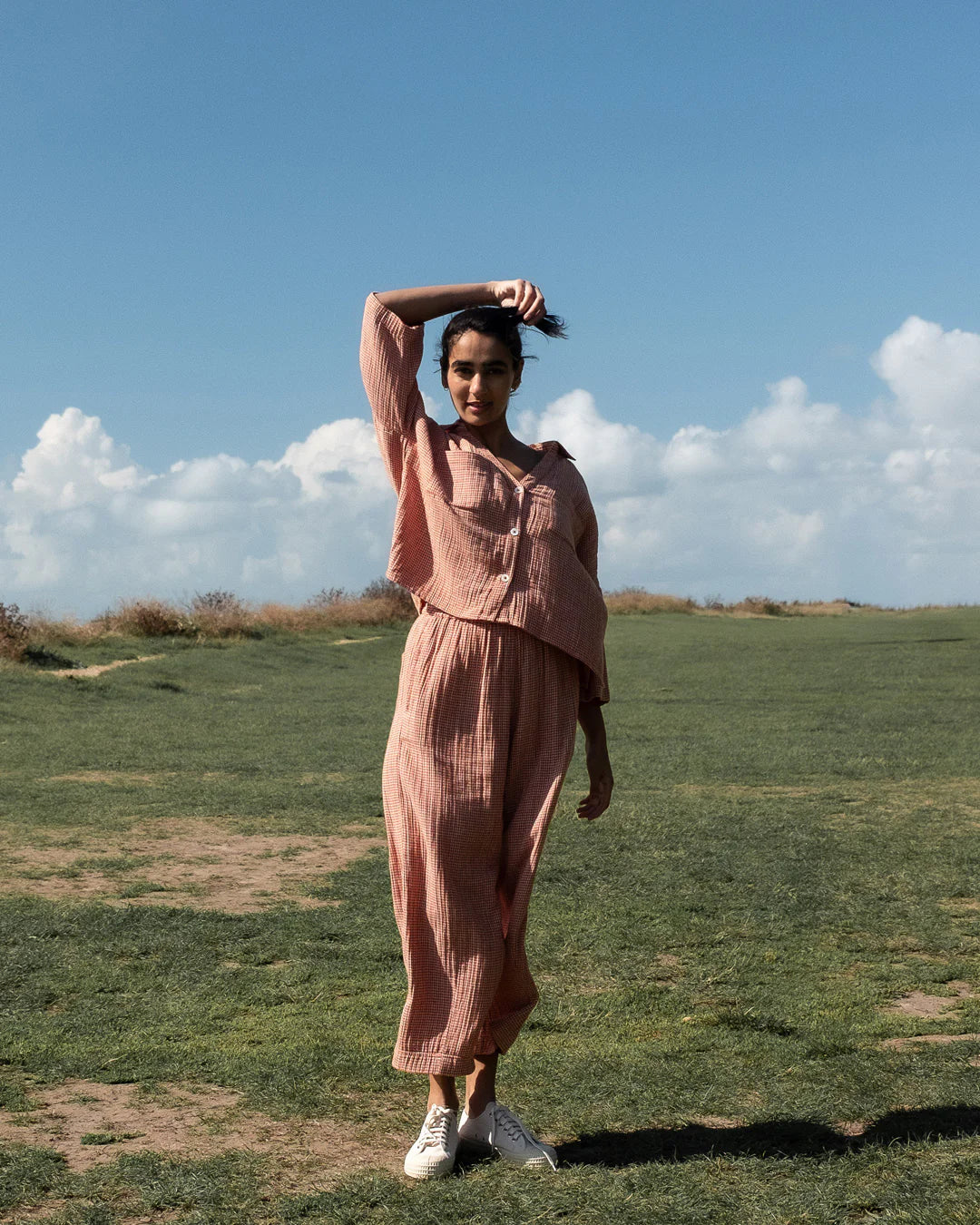 Offering easy everyday style with a softly tailored feel and made from 100% cotton. A warm rust and ecru check brings a gentle pattern. Cut with a relaxed fit and a gently cropped, tapered leg, they feature a fully elasticated waistband for all-day comfort. Side pockets and two large patch pockets at the back add practicle detail. A timeless piece made from natural fabrics with artisan care.