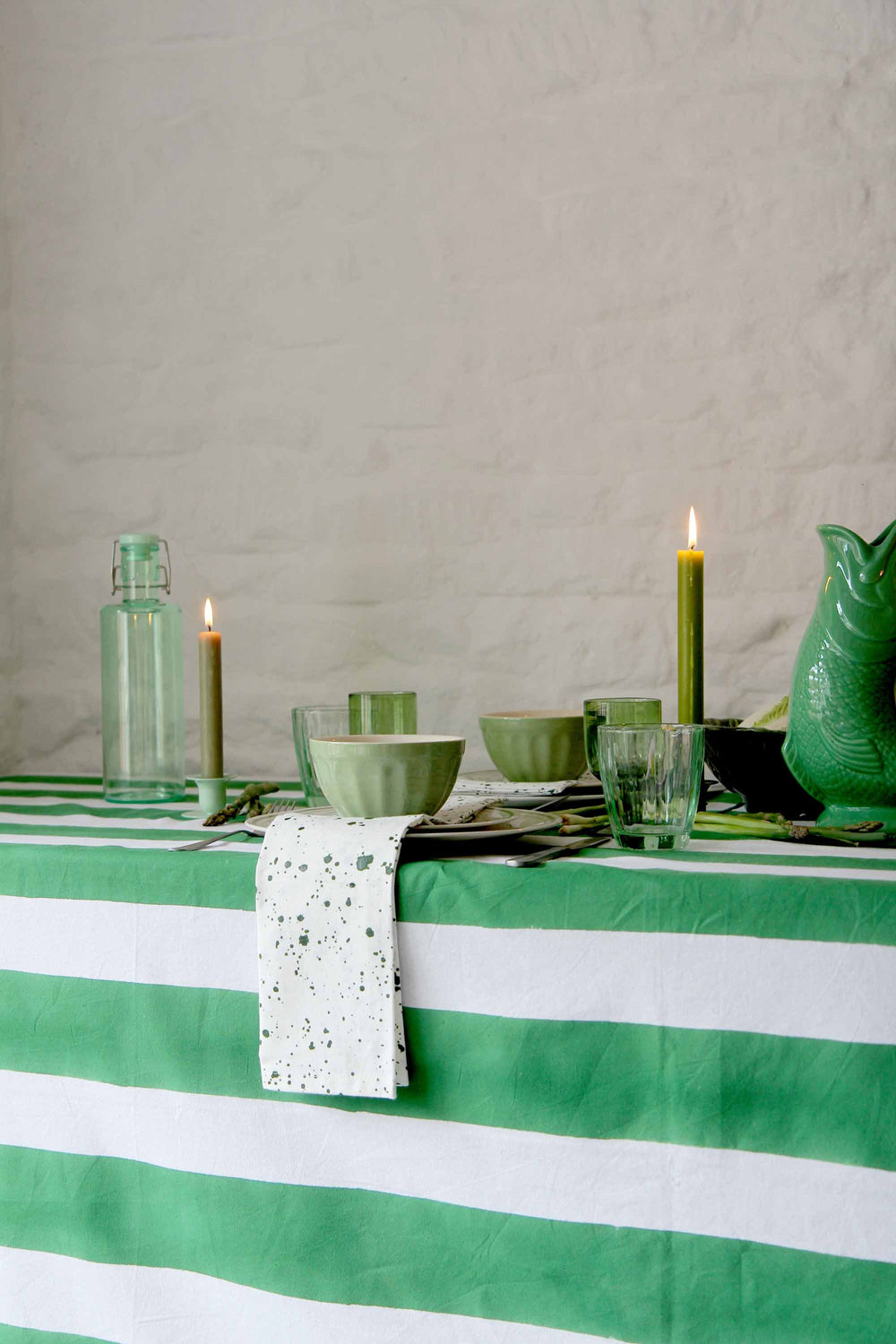 Elevate your dining experience with these exquisite hand block printed napkins featuring a contemporary splatter design in elegant green on pure white cotton.