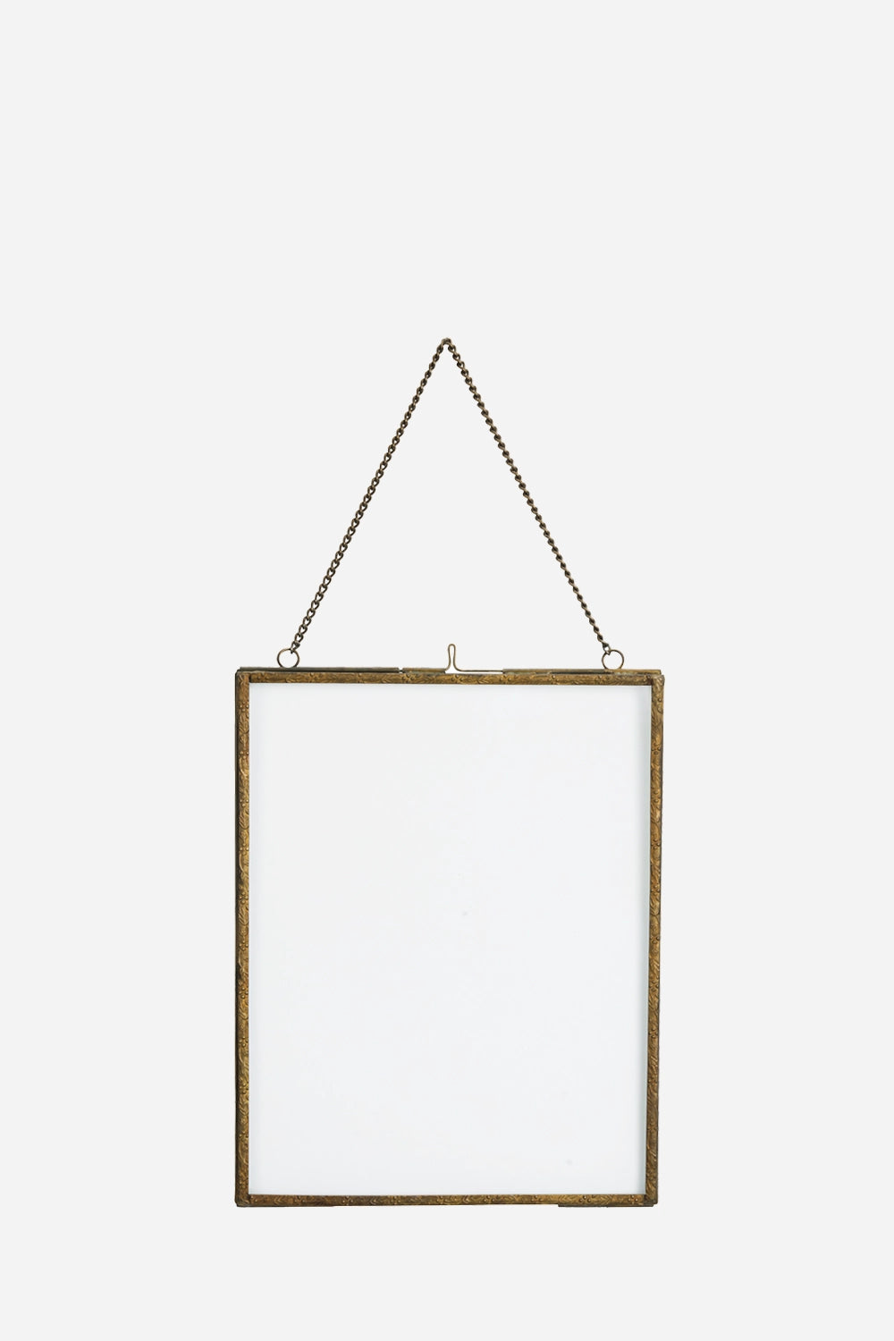 A hanging photo frame by Madam Stoltz, crafted in India from iron and glass with a clear, aged brass finish. The decorative embossed edge carries delicate floral imprints, adding a gentle vintage character that sits comfortably within a range of interiors.