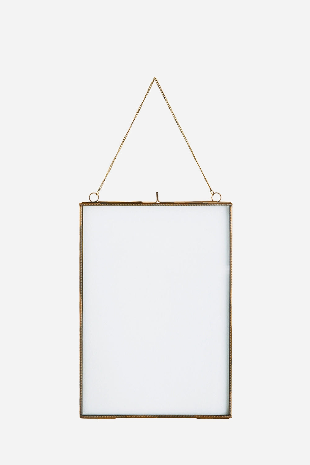 Designed with glass panels on both sides, the frame allows photographs or small prints to be viewed from either direction. The fine hanging chain makes it easy to place in a window or on the wall, bringing everyday memories quietly into view.