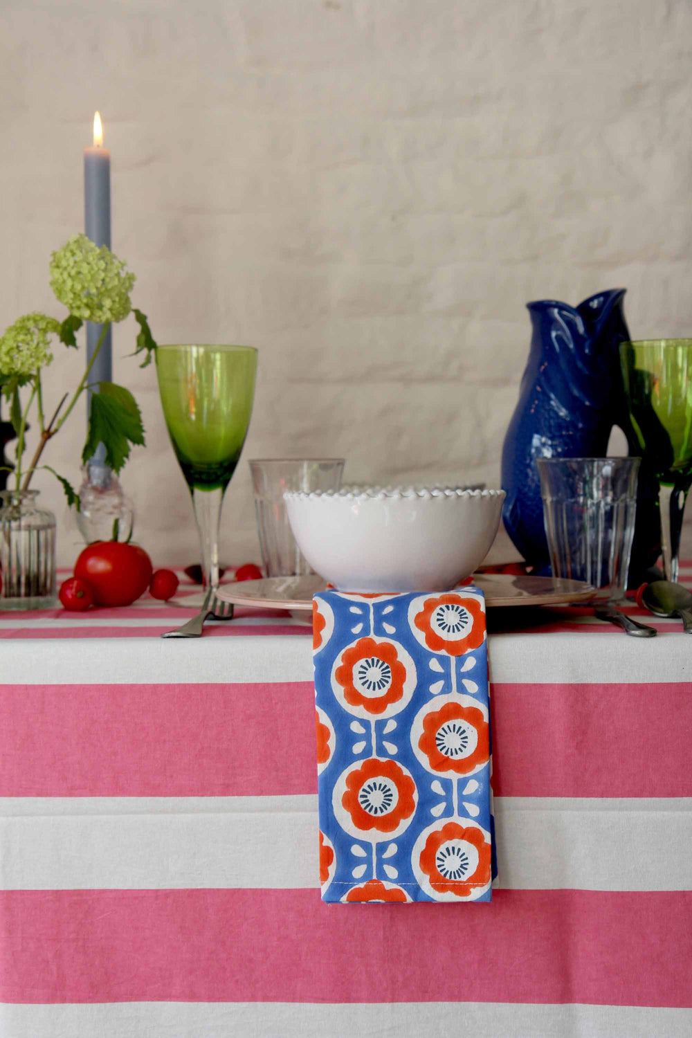 Elevate your dining experience with these exquisite hand block printed napkins featuring a bold red and blue daisy pattern.