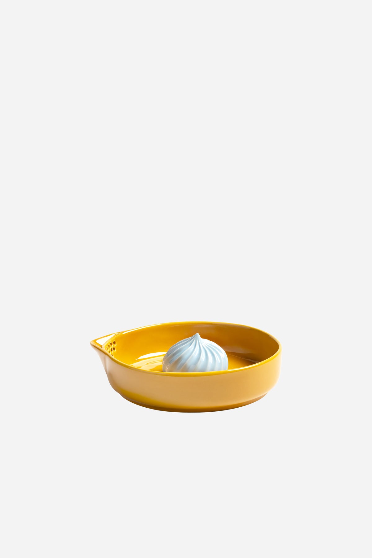 Combine function and fun with the Pudding shaped lemon squeezer in yellow and blue. Topped with a whipped cream swirl that looks like a sweet treat, this ceramic piece has a clever twist as a fully functional citrus juicer! The contrasting coloured bowl features a practical pouring spout designed for smooth, no-fuss flow.