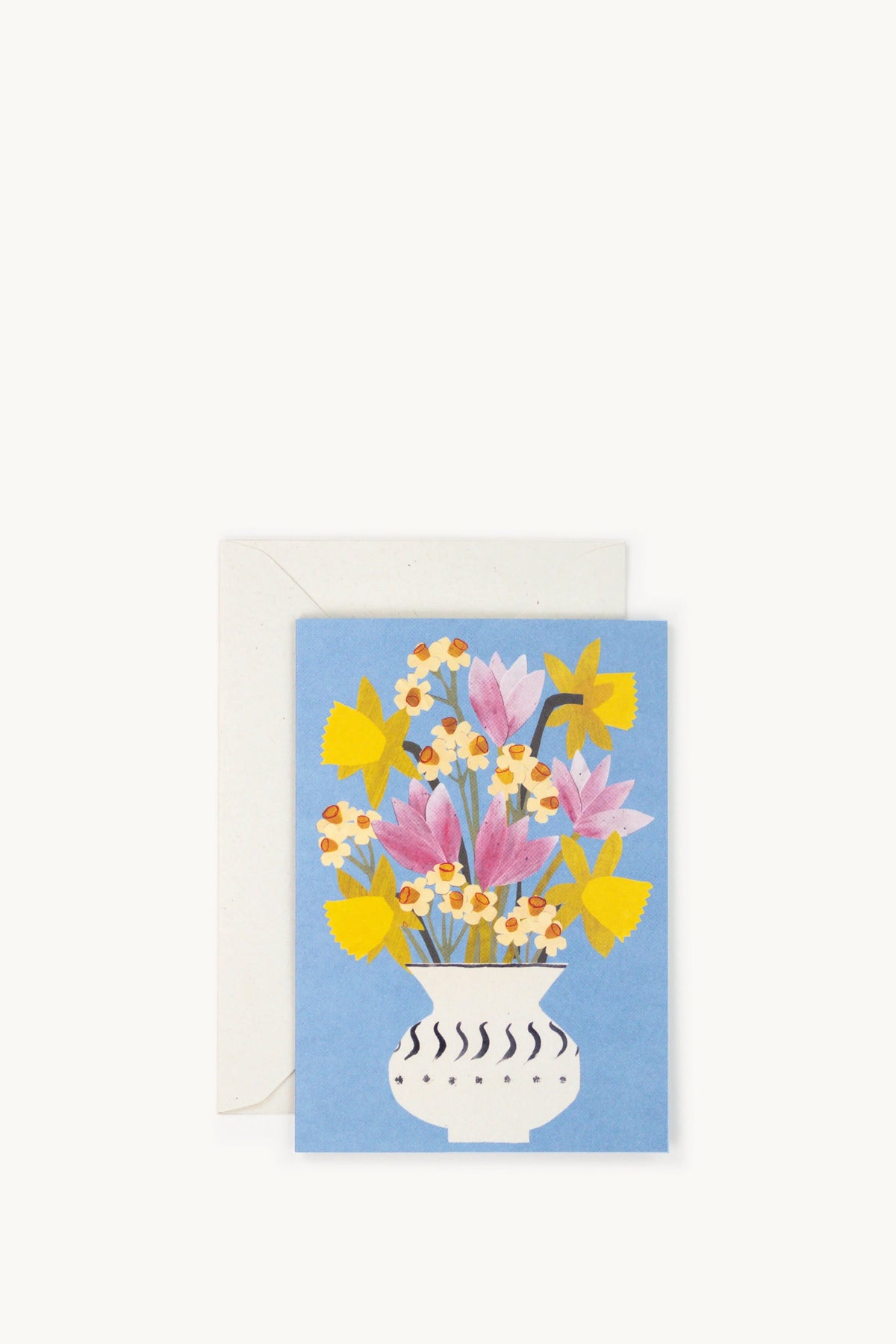 A beautiful spring flowers card from Hadley, featuring a bouquet with daffodils, narcissus and tulips on a cornflower blue background. Cheerful and bright, it’s a lovely reminder of the freshness and optimism of spring.