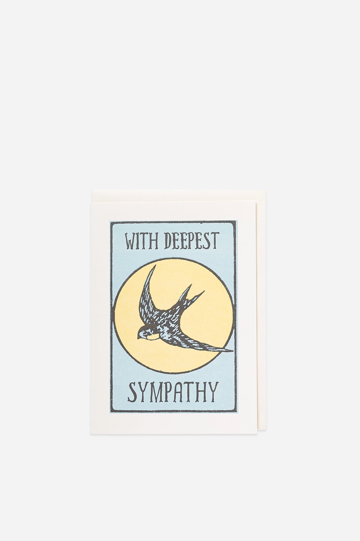 A heartfelt letterpress greetings card featuring a serene swallow soaring in front of the sun with the words With deepest sympathy; a design that balances gentle emotion with Archivist Gallery’s signature bold, colourful inks.
