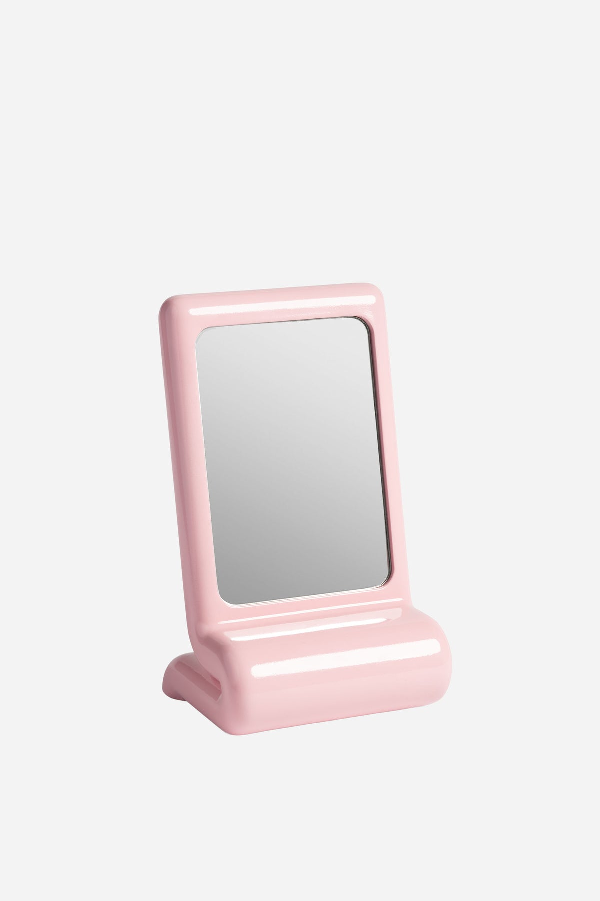 Playful vanity mirror in pink; where bold design meets everyday function. With its chunky, candy-inspired silhouette and playful curves, this compact mirror is both sweet and striking, perfectly capturing &Klevering’s signature blend of softness and statement.
