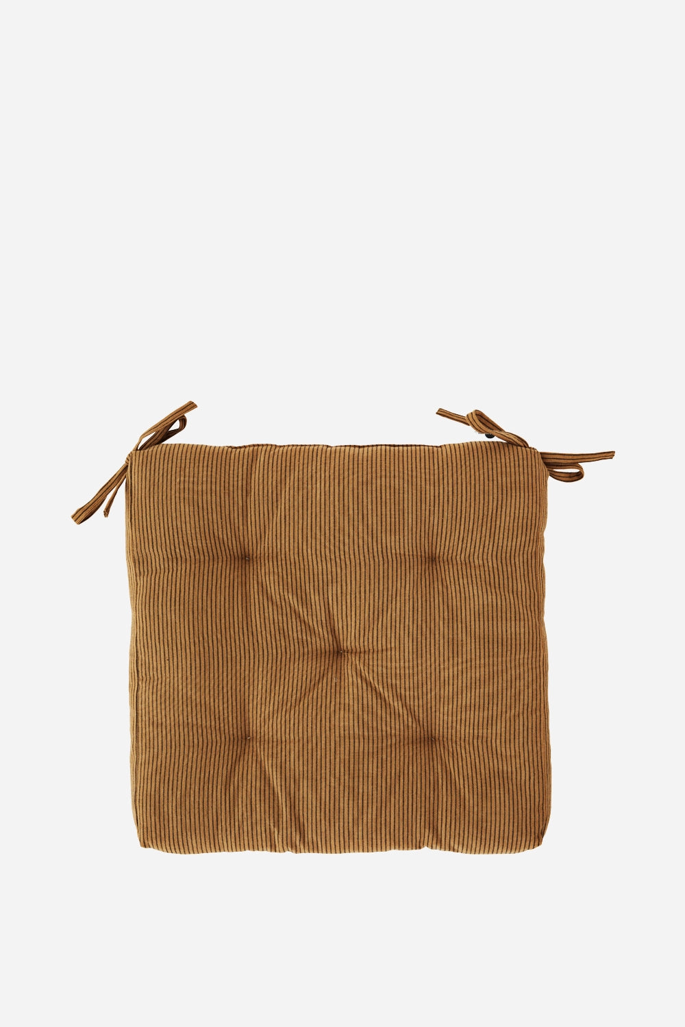 A striped cotton chair pad by Madam Stoltz, crafted in India and inspired by traditional Danish folk textiles. The Sugar Almond and fine black stripe brings gentle contrast and pattern to everyday seating, adding a relaxed decorative touch to dining chairs, desks, or reading corners.
