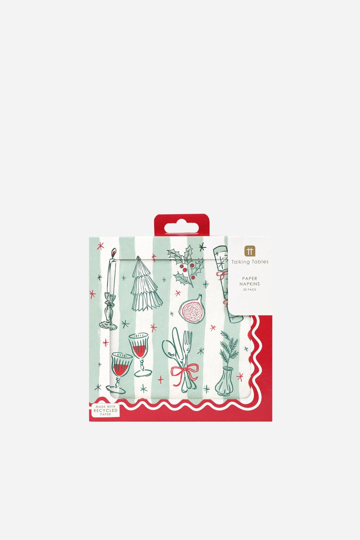 Set the scene for a joyful Christmas gathering with these Bon Noël Napkins. Illustrated in a charming sketch-style print of crackers, candles, figs, trees, and tipples, all framed by a festive red scalloped border, they bring playful sophistication to your table.