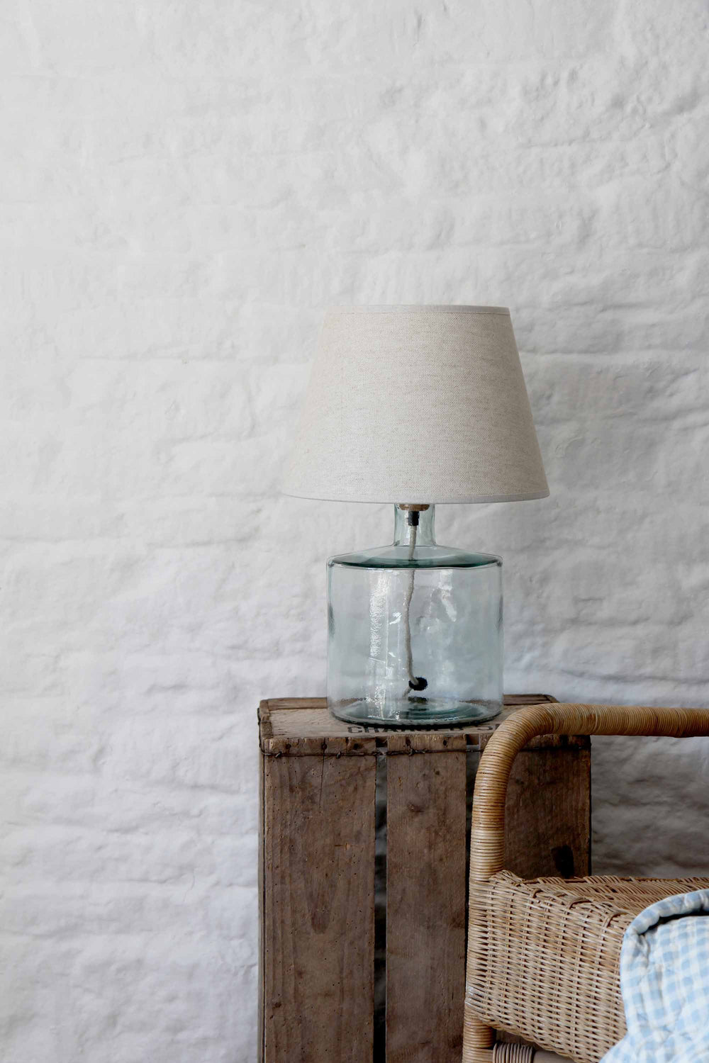 A squat shaped table lamp in clear recycled glass which has a slight blue/green tint. Recycled glass can contain small bubbles and imperfections which form part of the nature and charm of the finished product.