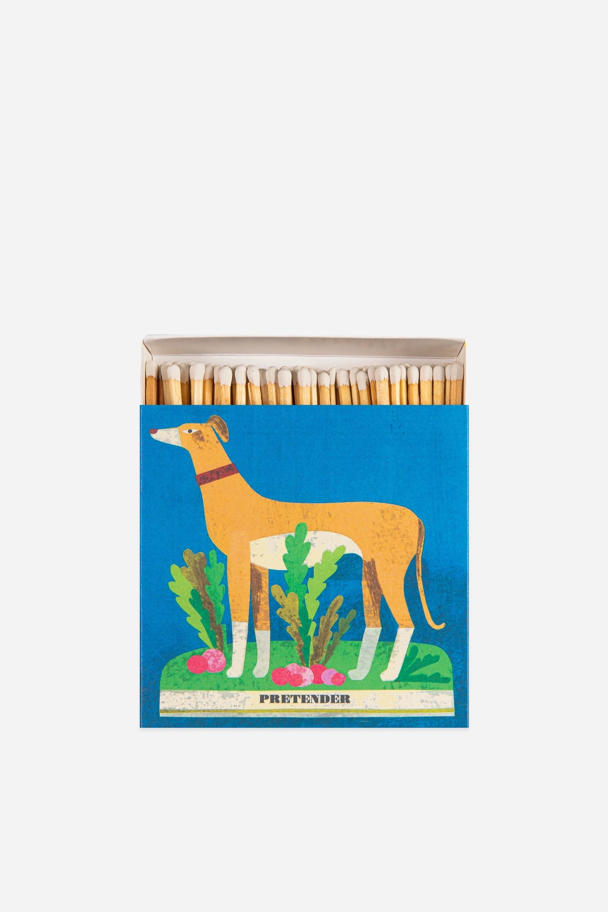 A beautifully illustrated square matchbox featuring a graceful whippet standing amongst a bunch of radishes against a bold blue background; a design that blends charm, character and everyday practicality. Striking in every sense, it’s a playful yet stylish piece to keep around the home.