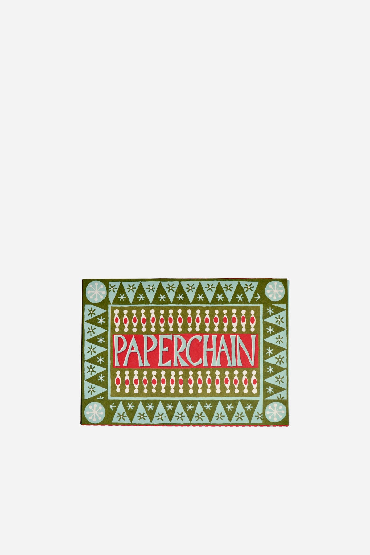 Festive paper decoration kit by Cambridge Imprint, containing 150 double-sided patterned strips in tones of red, pink and green that assemble into a 10-metre paper chain.