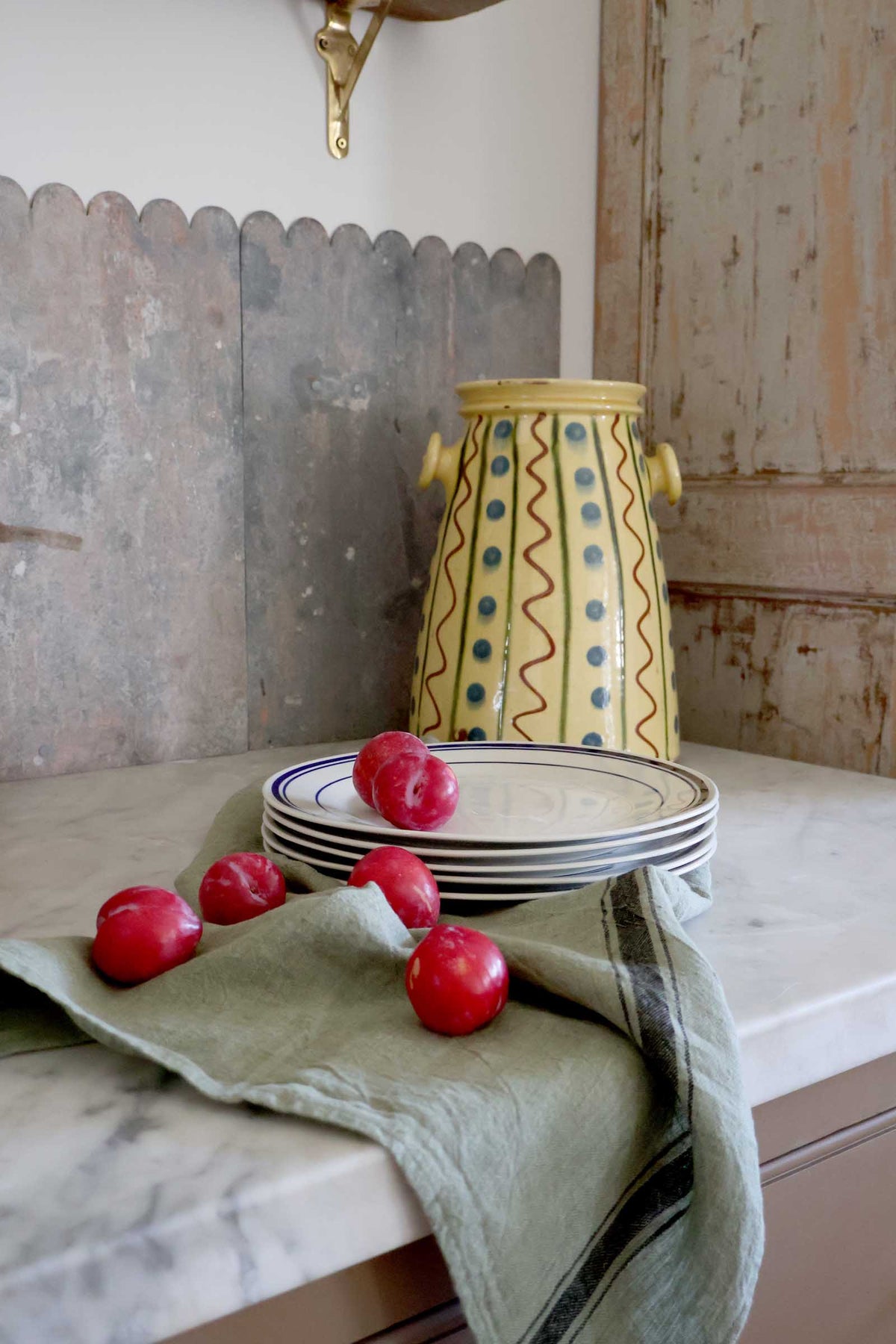 A stoneware dinner plate designed with a classic French aesthetic, finished in a soft cream glaze with a triple blue stripe. The simple decoration brings a sense of structure to the table while remaining easy to mix with everyday tableware.