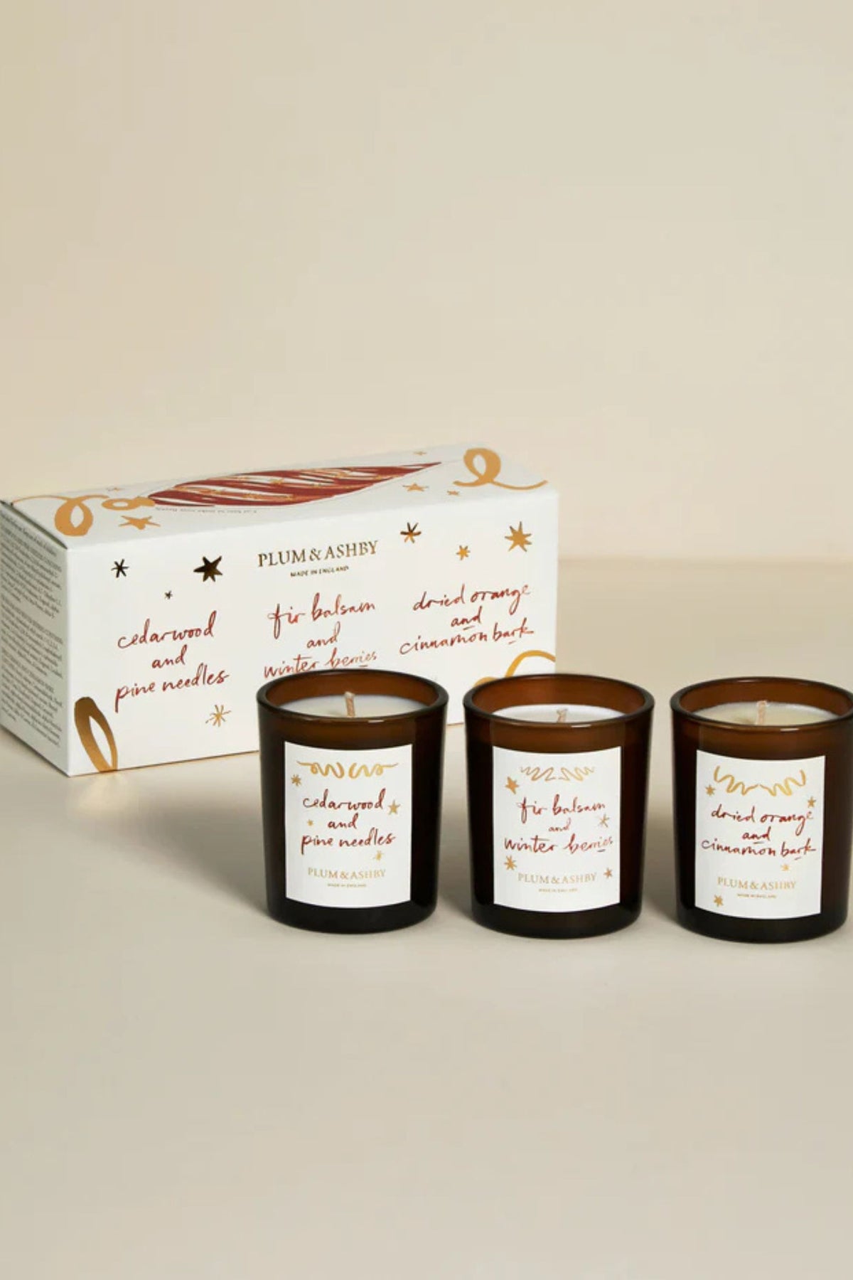 The Plum & Ashby Winter Set contains the verdant spiciness of three minature festive candles. Featuring the crisp scent of midwinter greenery with Cedarwood & Pine Needles, the indulgence of ancient incense with Festive Spice & Clementine or the wreath wrapping combination of the two with our brand-new scent, Fir Balsam & Winter Berries.