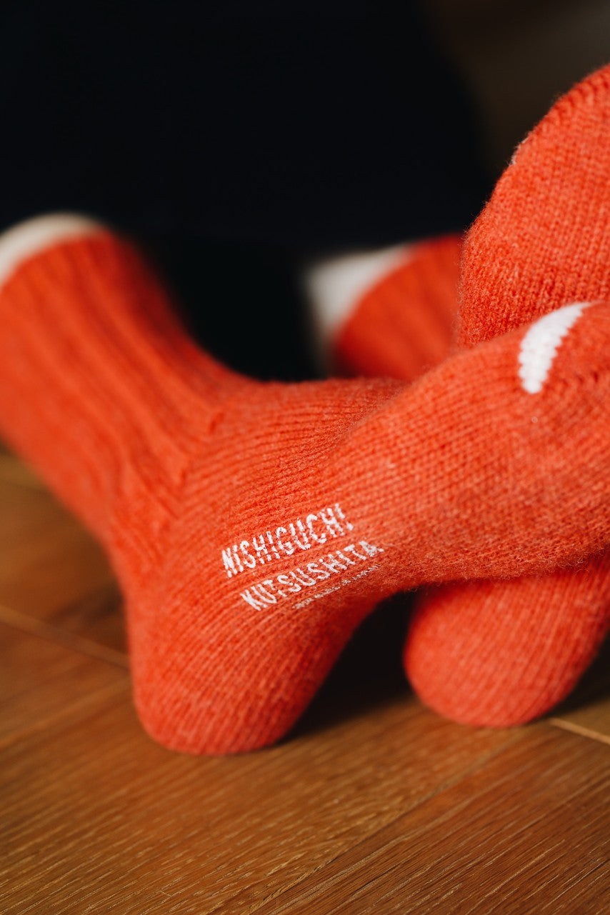 These Wool Ribbed Socks in Shrine Red from Nishiguchi Kutsushita are crafted from ultra‑soft Polwarth wool for a thick, cosy feel that stays surprisingly lightweight. The ribbed knit offers sturdy structure and natural stretch, making them ideal for autumn and winter.