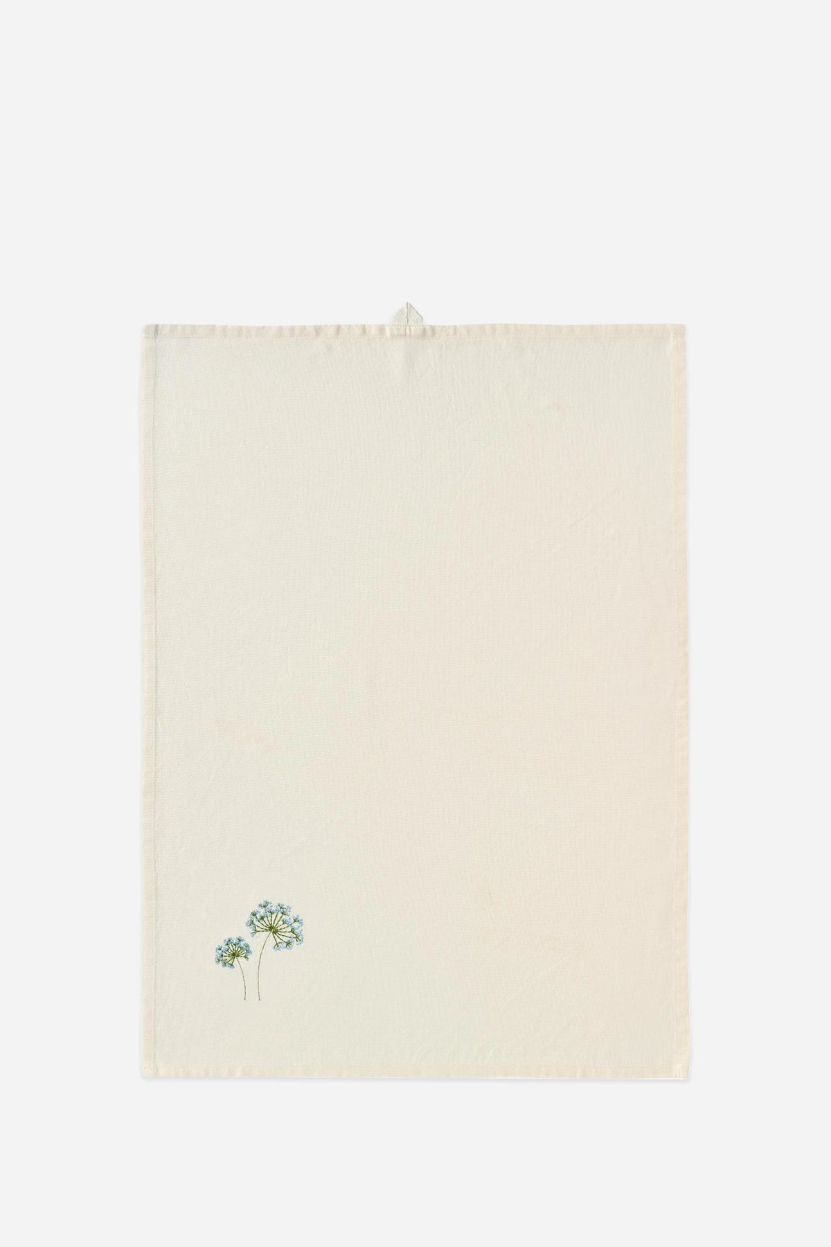 Bring a touch of timeless charm to your kitchen with this cotton tea towel in a soft butter cream colour. Featuring a beautifully embroidered Umbellifer flower motif in classic blue, it evokes the warmth and character of a country kitchen and pairs perfectly with traditional kitchen linens.