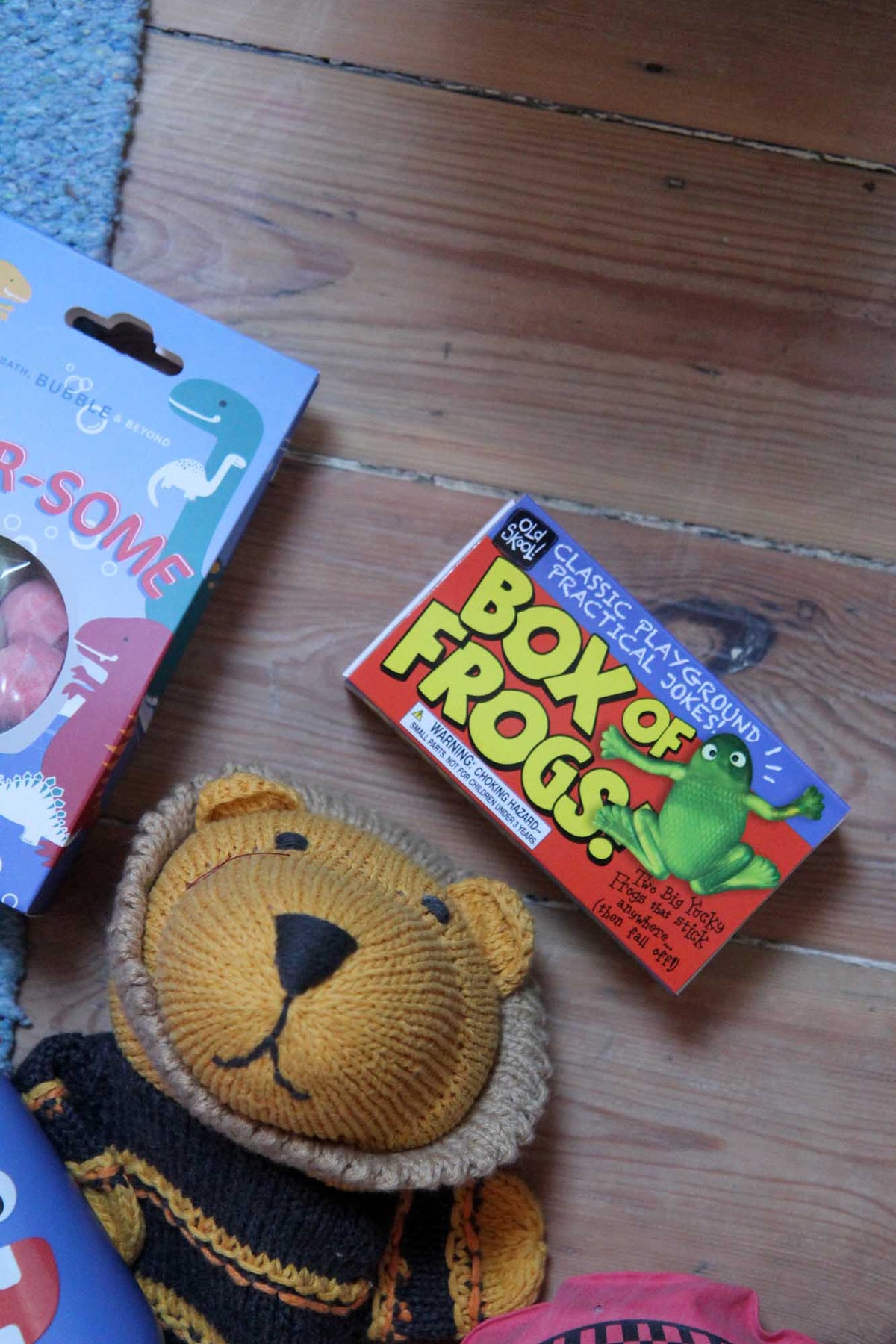 A box of 'Box of Frogs' toy, showing the product name and a few toy frogs outside the box.