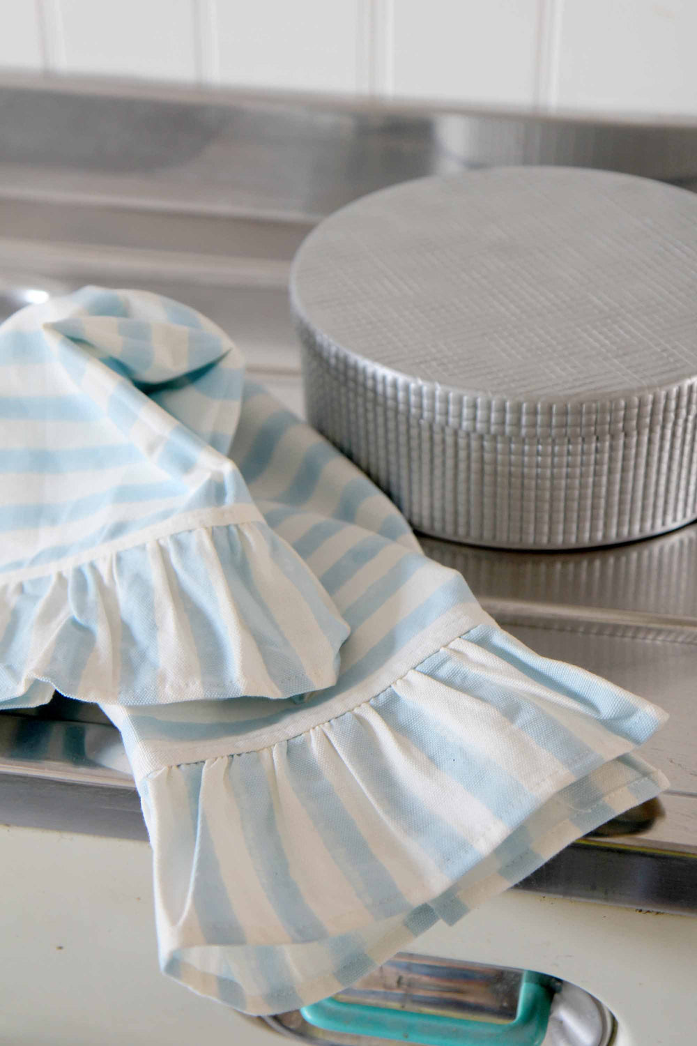 Do the dishes in style and add a playful touch to your kitchen with this Sky Blue and White Ruffle Stripe T-Towel. Its bold, block printed stripes and ruffle trim make for a unique statement piece, perfect for brightening up your home interiors.