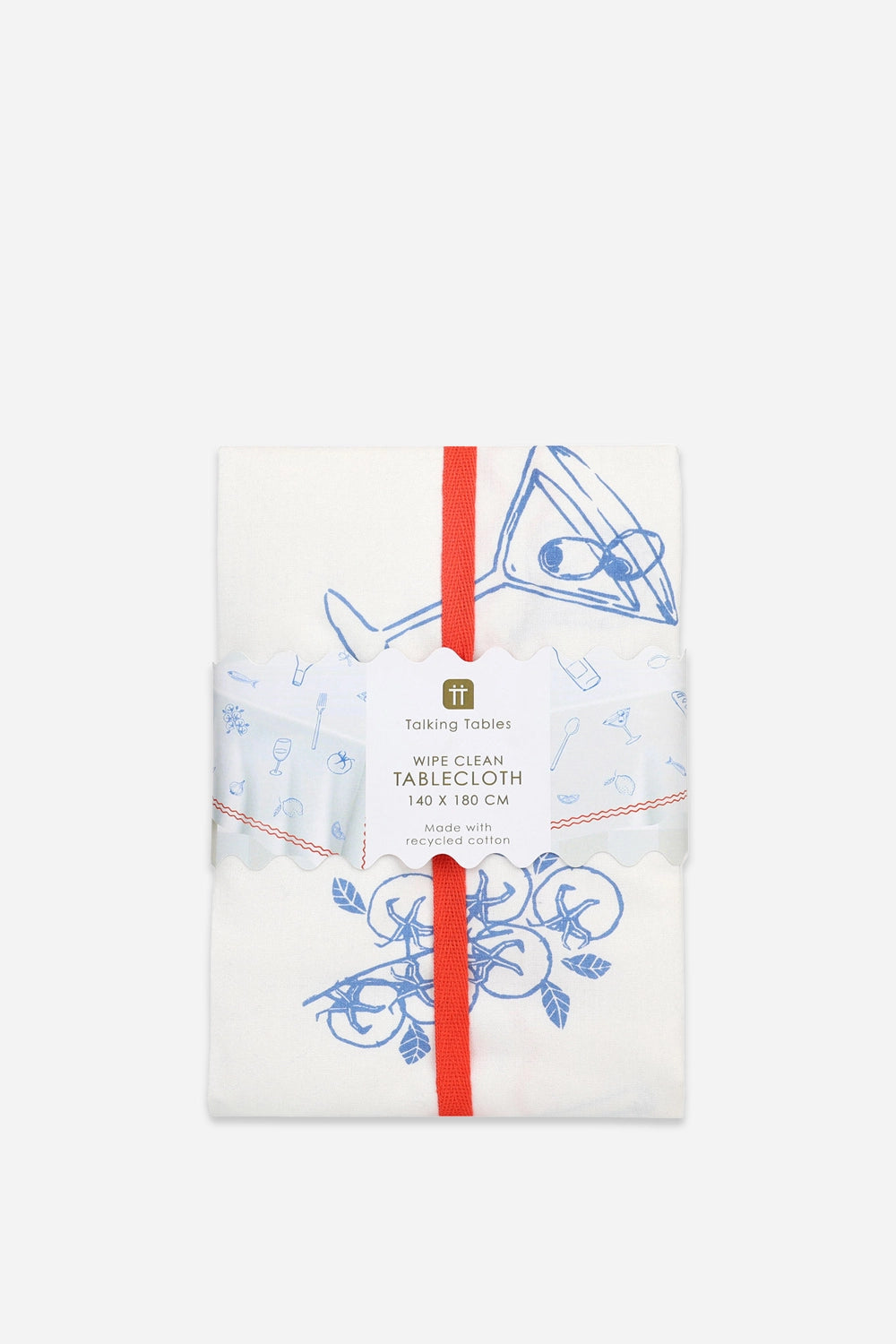 Bring a splash of colour to your table with this Bon Appetit Fabric Table Cover. Made from soft, durable cotton, it is easy to care for and designed for everyday use. Adorned with cheerful blue and white food illustrations and a wavy red border, it adds a subtle yet lively accent to your dining space.