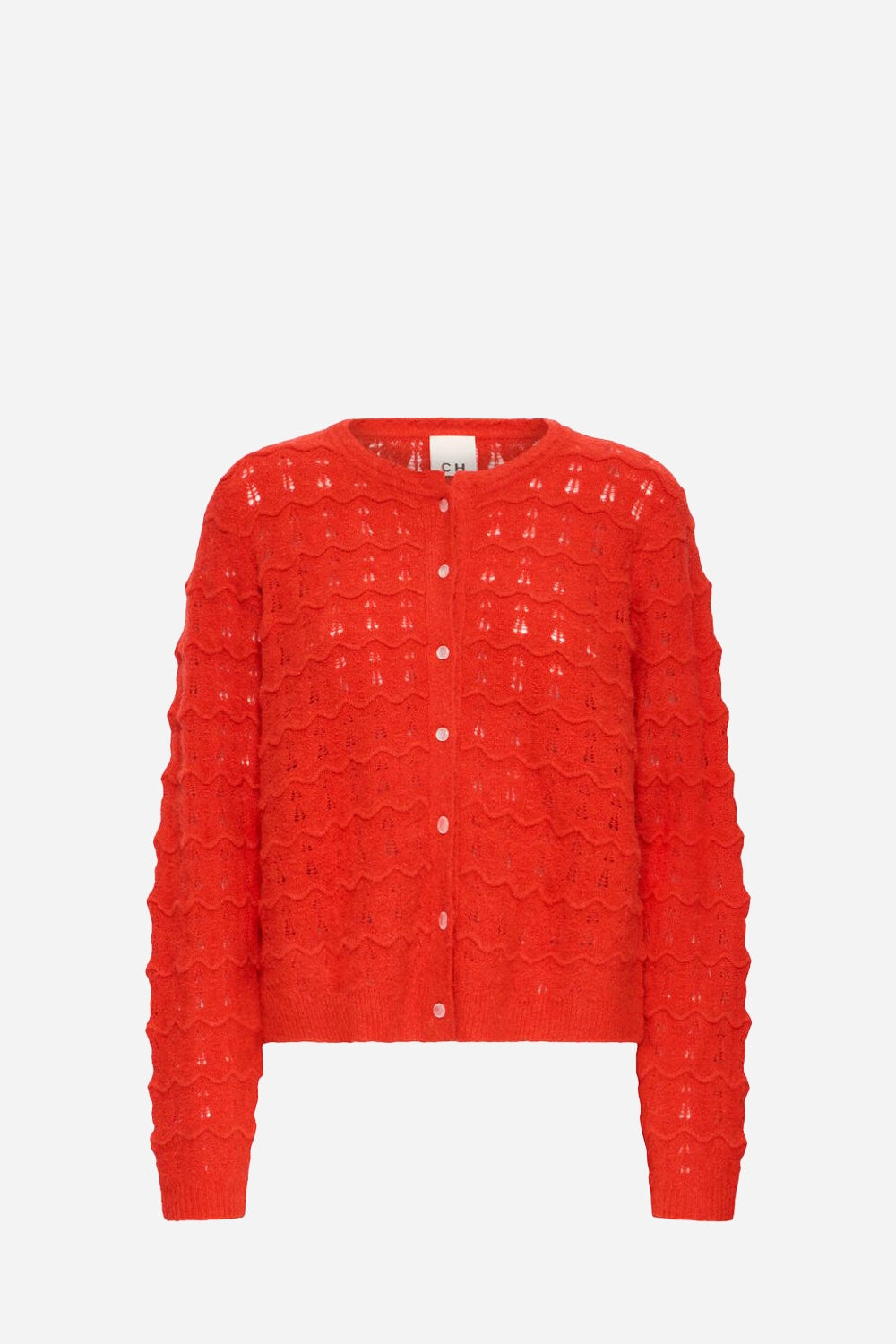 A soft textured knit cardigan in fiery red, designed for easy layering over shirts, blouses or light tops. Its long sleeves and relaxed fit make it a versatile addition to spring wardrobes, offering a simple way to introduce colour without overwhelming an outfit. The knit holds its shape well, draping gently for a comfortable, effortless look throughout the day.