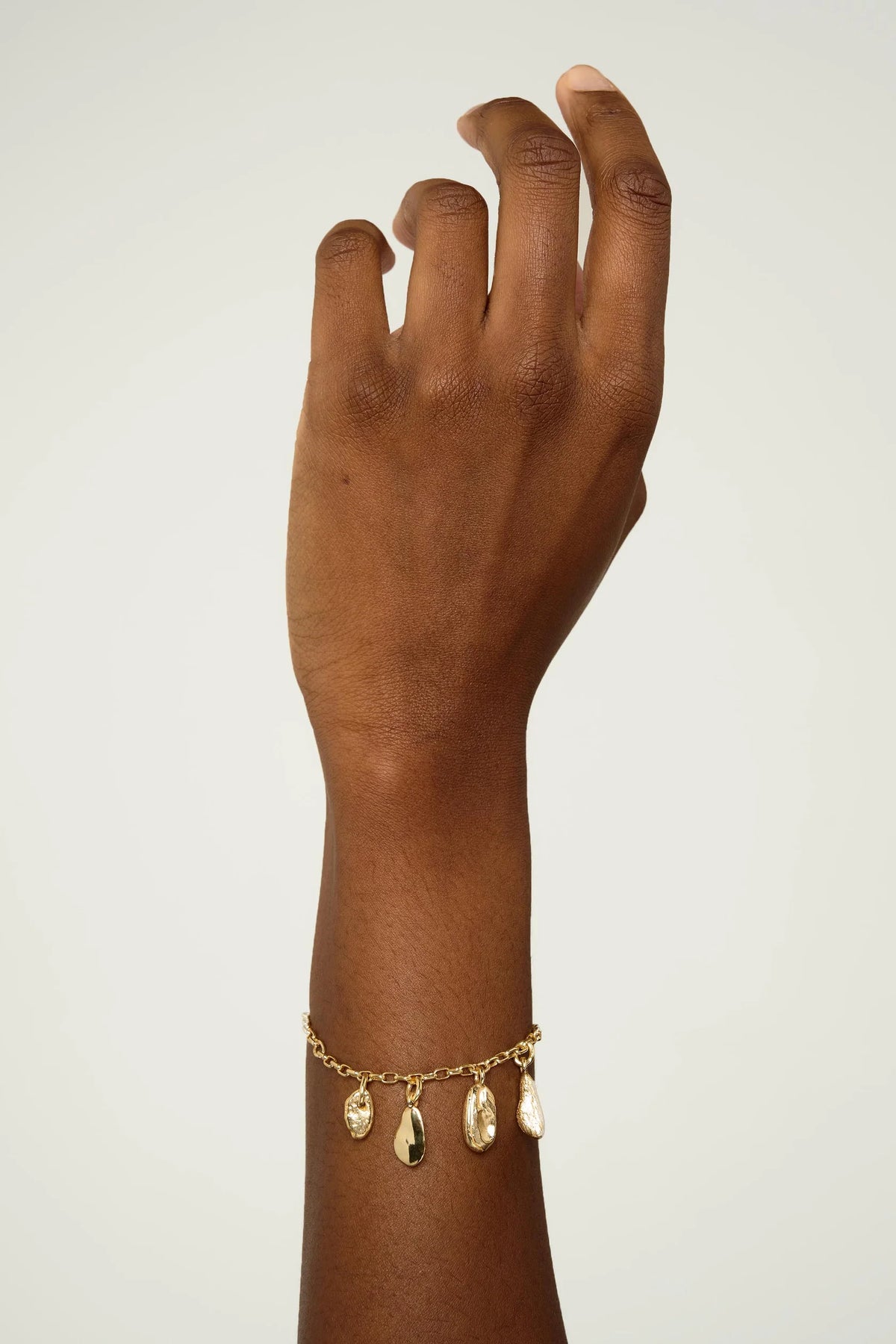 Featuring four individual sculpted charms with an organic form, each charm has its own character. The textured and polished surfaces of each charm catch the light beautifully, while the gold-tone link detail adds subtle contrast and a modern finishing touch. The bracelet also features a charming inscribed tag adding a distinctive designer touch.