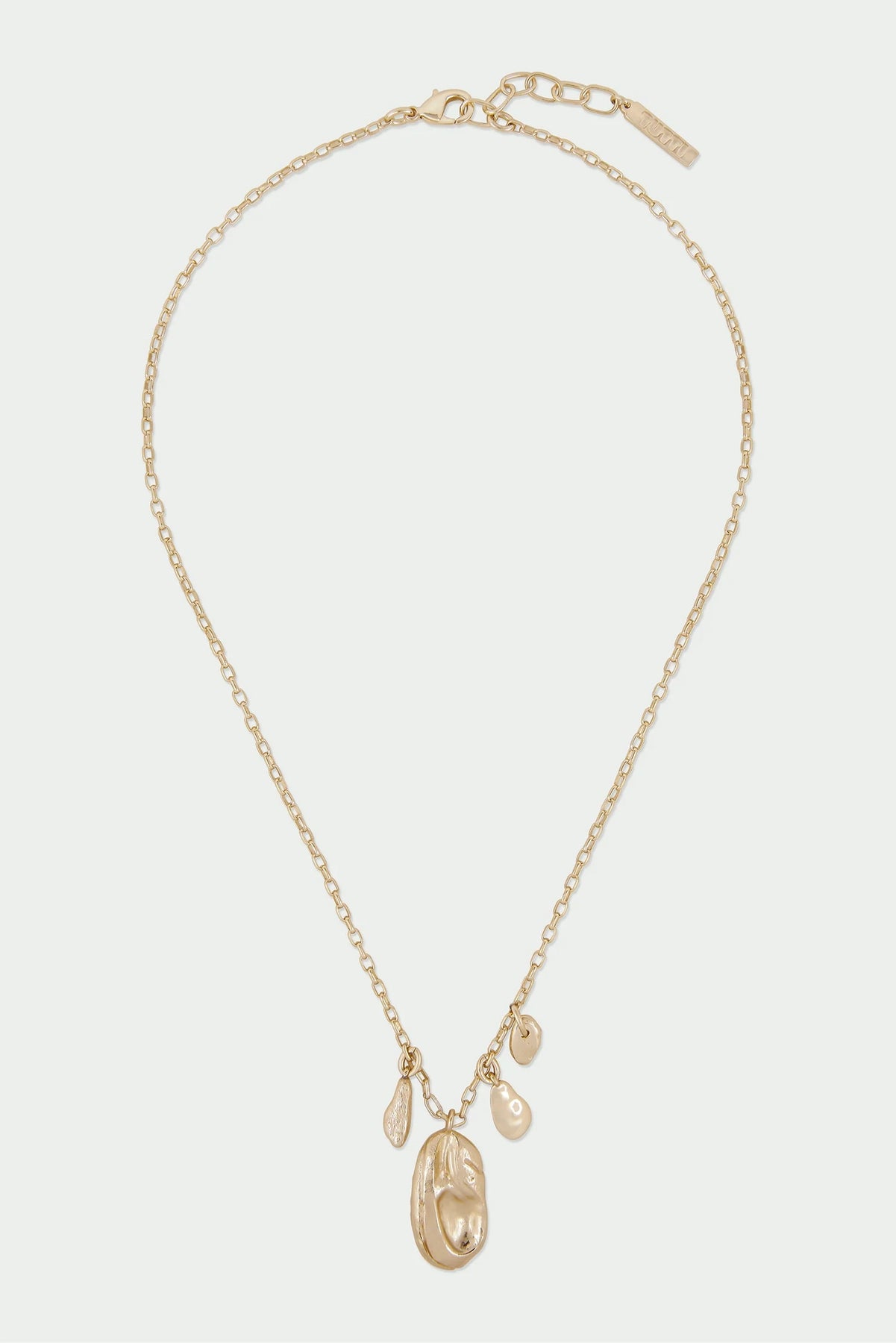 Featuring a four softly sculpted organic pebble-style pendants on a beautiful link chain, this necklace brings gentle movement and natural texture. An elegant yet relaxed look that pairs with both day and evening wear.