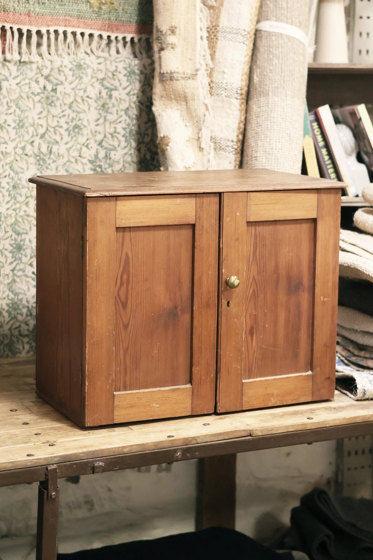 A sturdy little pitch pine cupboard, full of simple, honest charm. With two classic panelled doors and a warm, natural grain, it brings a quietly traditional feel to your space; perfect for adding a practical yet characterful storage solution.