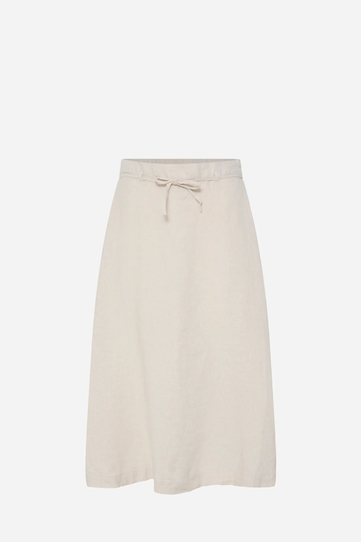 A beautiful linen skirt in Cloud. The clean shape is designed to fall gently and feel comfortable all day. An elasticated waist to the back keeps the fit feeling secure. The matching linen tie belt and loops add a simple detail.
